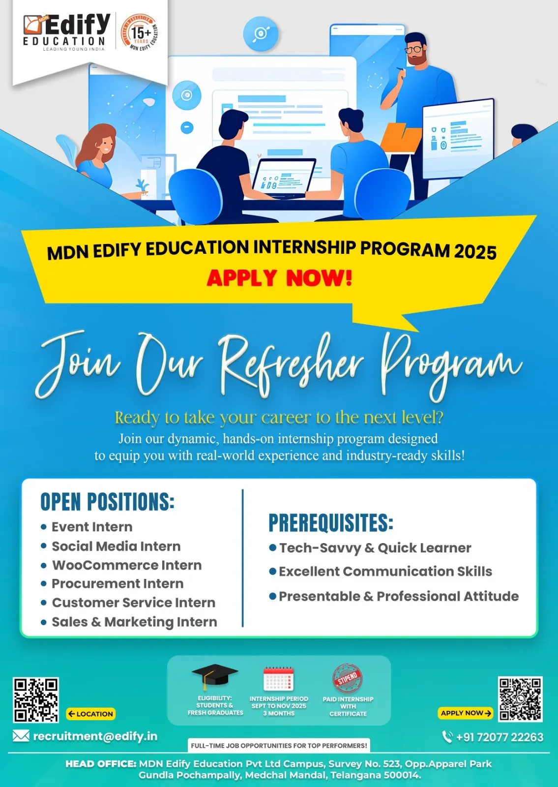 Professional Growth : At Edify Schools, we value continuous professional development. We provide opportunities for our educators to enhance their skills, attend workshops and conferences, and engage in lifelong learning. We support your growth as an educator and encourage you to reach your full potential.